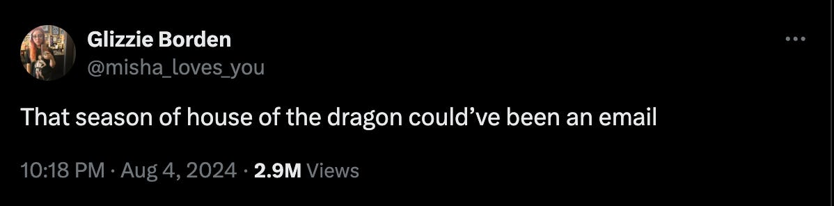 These decisions reached a polarizing head with the season finale. After an extended montage of our characters suiting up for what promised to be a critical fight in the Dance of Dragons, the episode…ended. The noteworthy lack of any sort of climactic battle ruffled scales across the Seven Kingdoms and prompted a number of news outlets to resurface reports that the writers of HOTD were restricted to eight episodes on account of the writers’ strike last summer.
